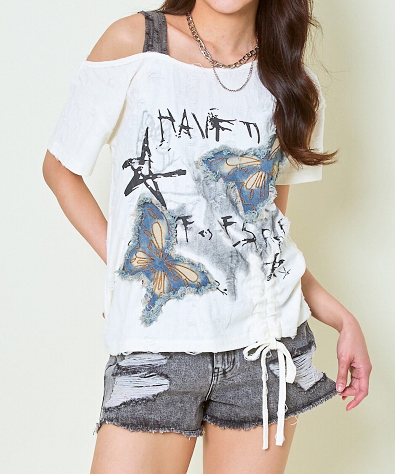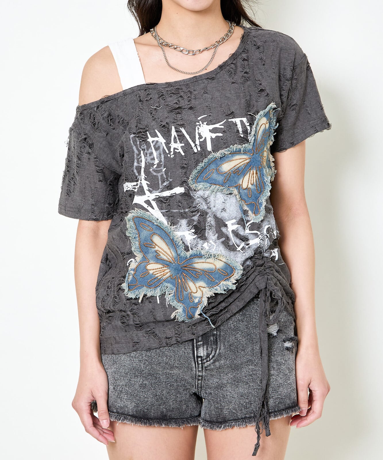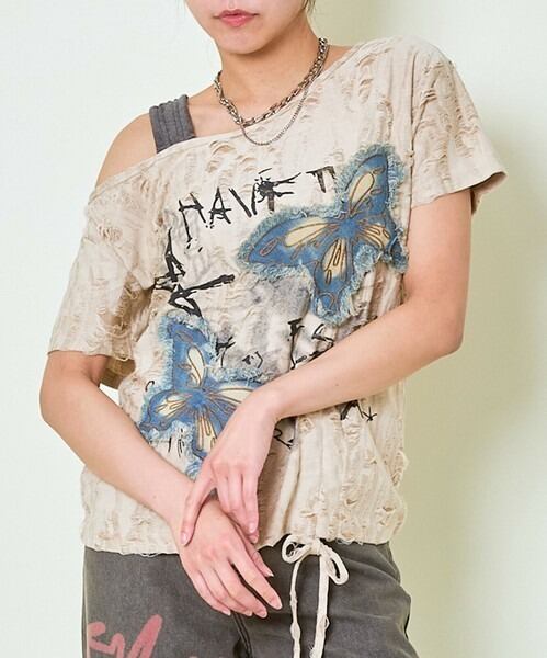 半袖仕様なので春から夏にかけてのシーズンにぴったり。腕を程よくカバーしつつ、肩の部分がオープンになっているため、暑い日でも涼しげな印象をキープできます。