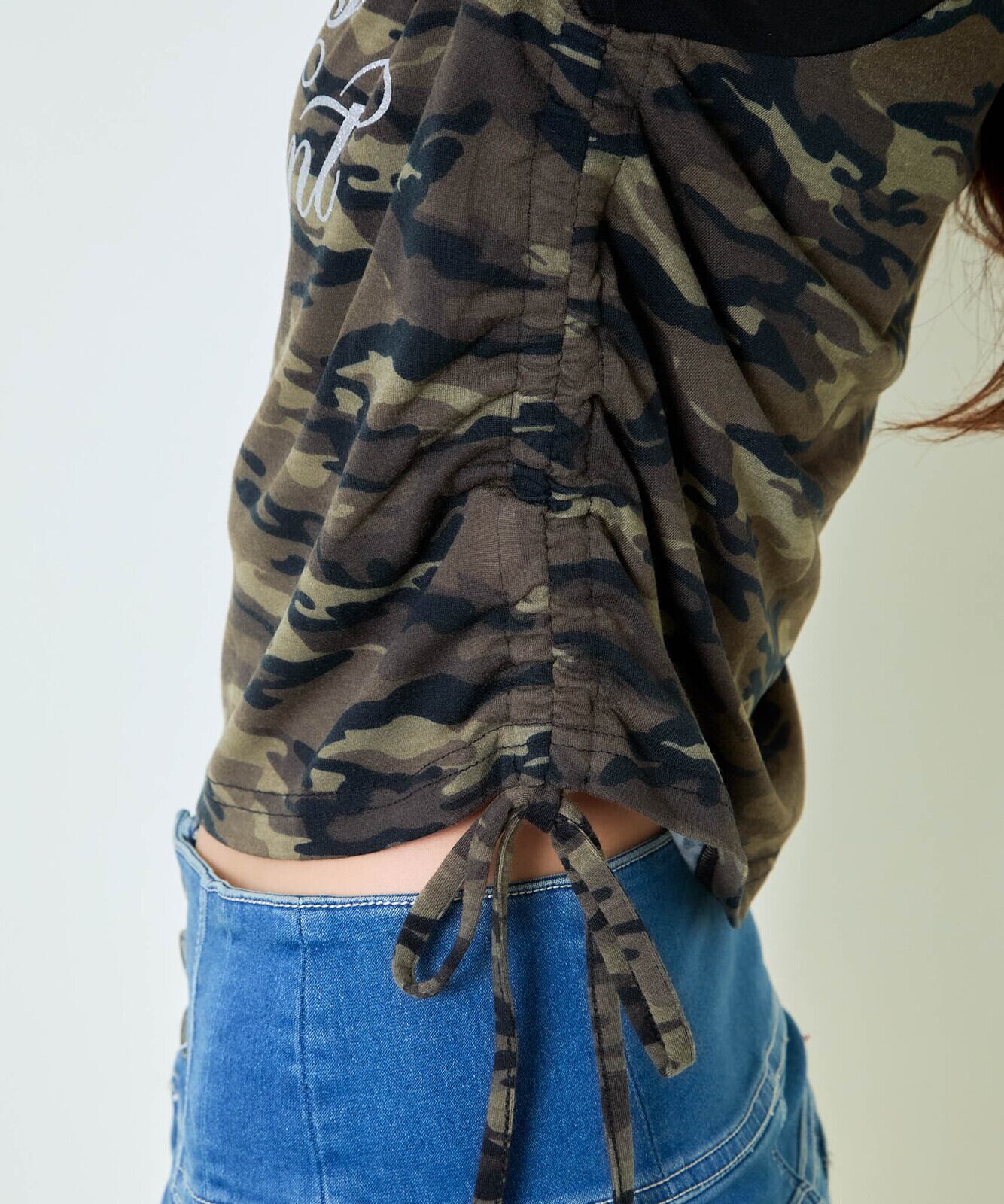 ラグランスリーブ風の切替で、アクティブ感のあるシルエットに。フロントのロゴは、光が当たるたびにさりげなく輝いて視線を引きつけます。サイドドロストでギャザーを寄せれば、ウエストラインが引き締まり、スタイルアップ効果もバッチリ♪
