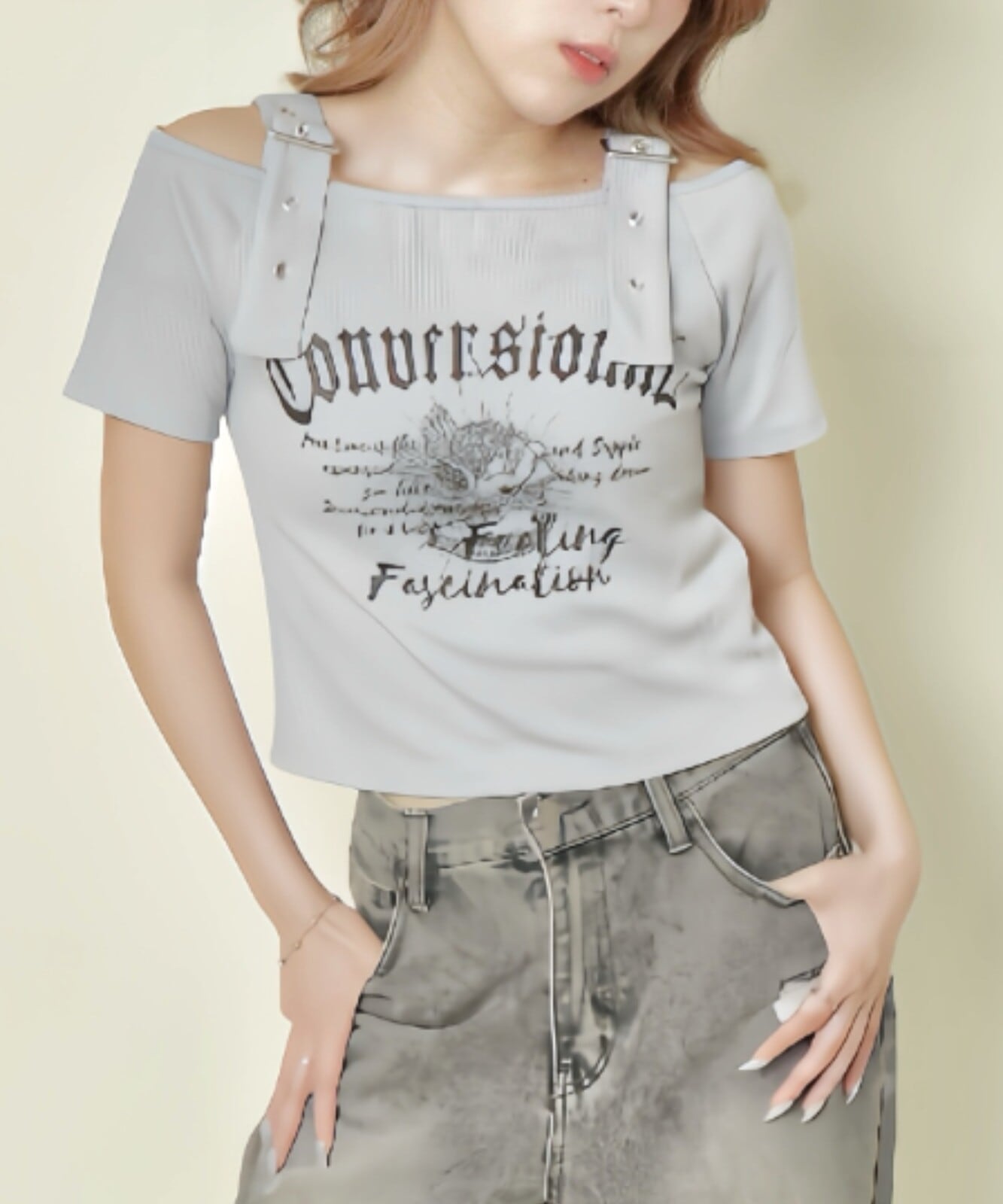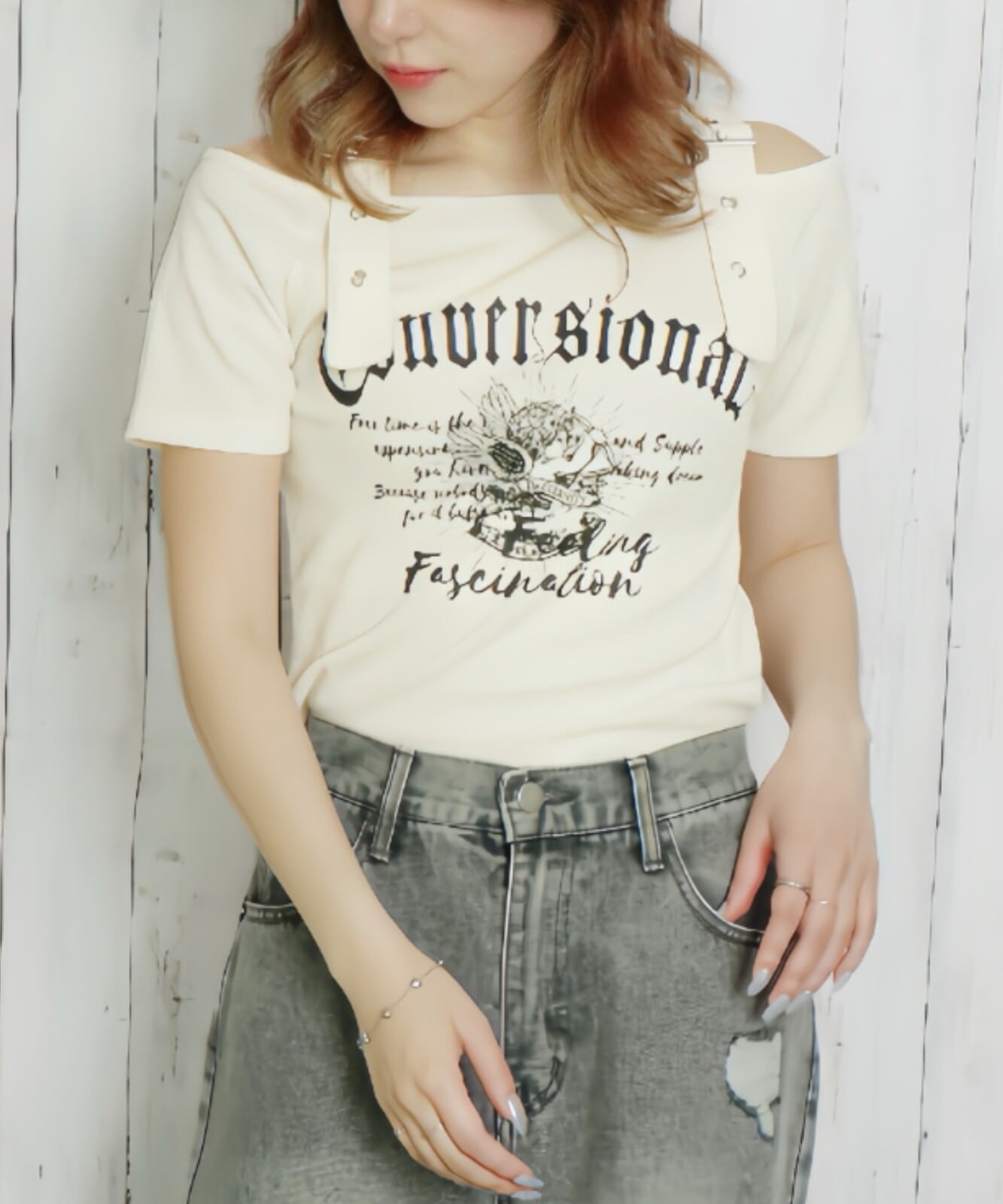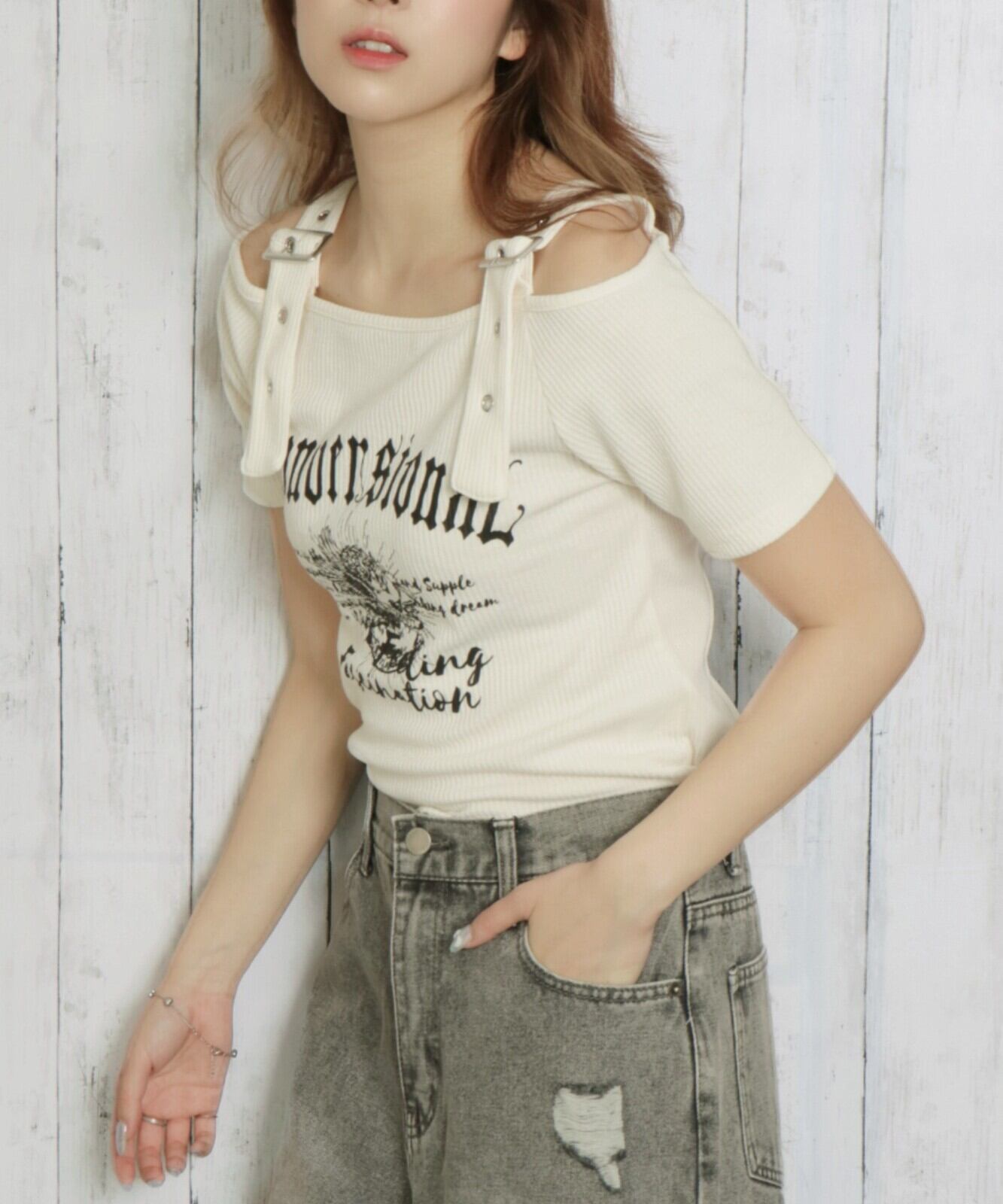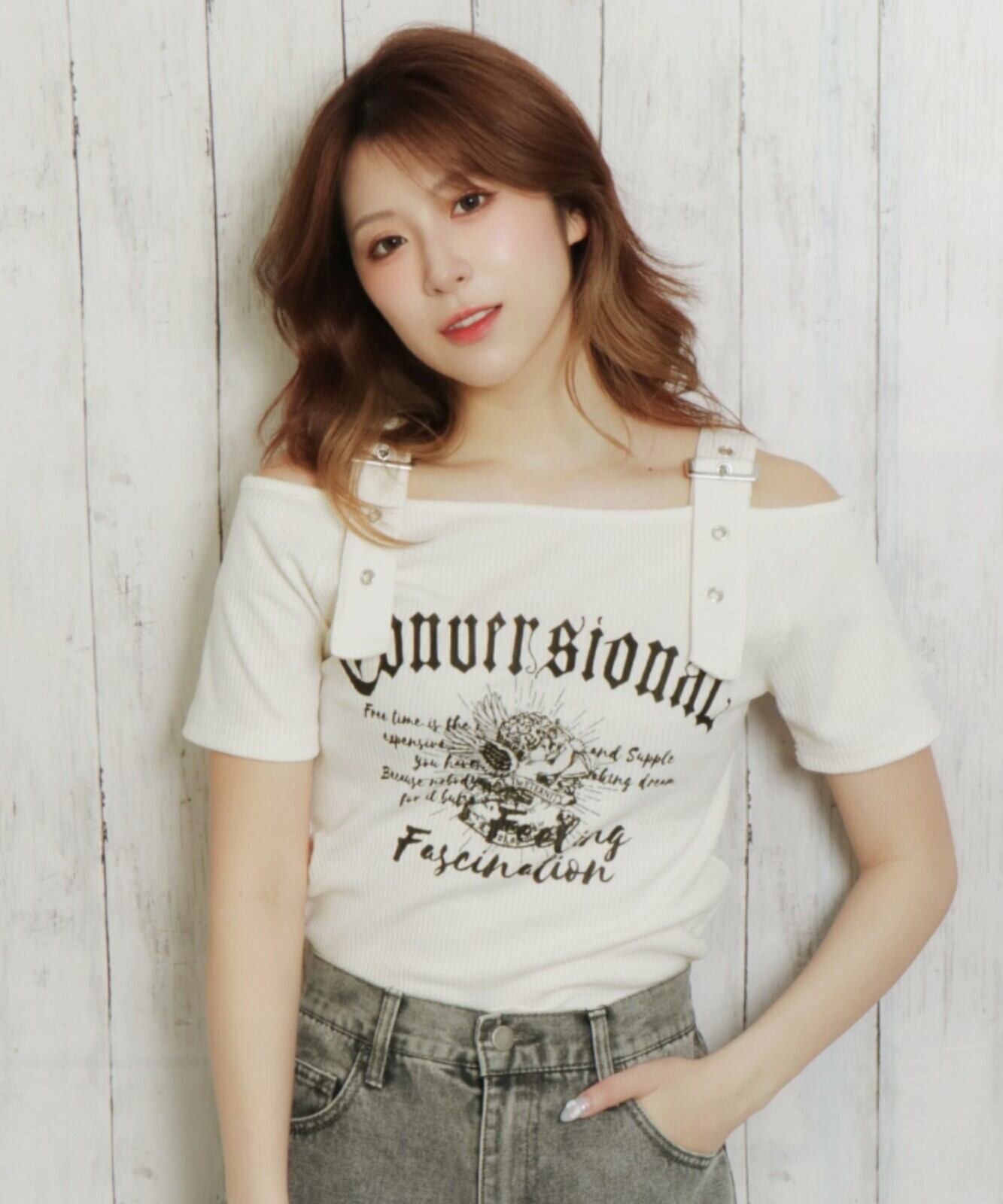 オフショル風の肩開きデザインに、ベルト風ストラップをプラスしたインパクト抜群の一着。ボディはほどよくフィットするリブ素材で、女性らしいシルエットを際立たせつつも、カジュアルな抜け感を演出。フロントには羽のモチーフと英文ロゴが組み合わさり、メッセージ性のあるビジュアルに仕上がっています。ストラップの金具やボタン使いも、コーデのアクセントにぴったり◎
