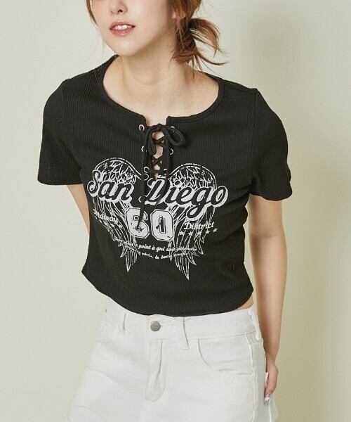 フロントのレースアップで視線集中!デザイン映えするテレコ素材トップス♪